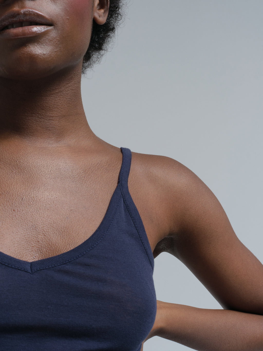 Top mit tiefem V-Halsausschnitt und geradem Rückenaufschnitt.