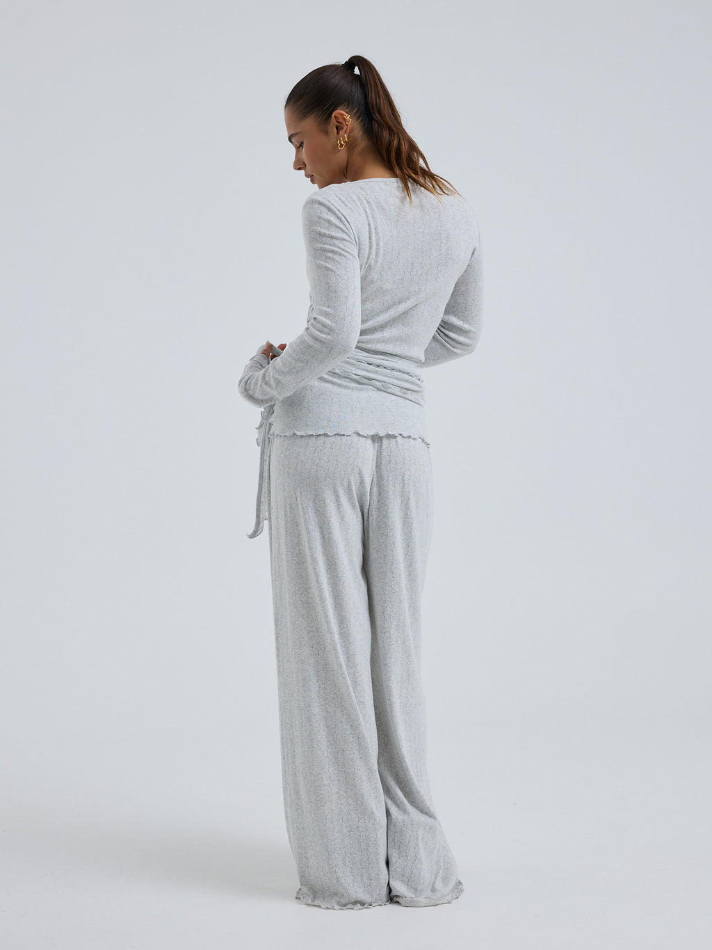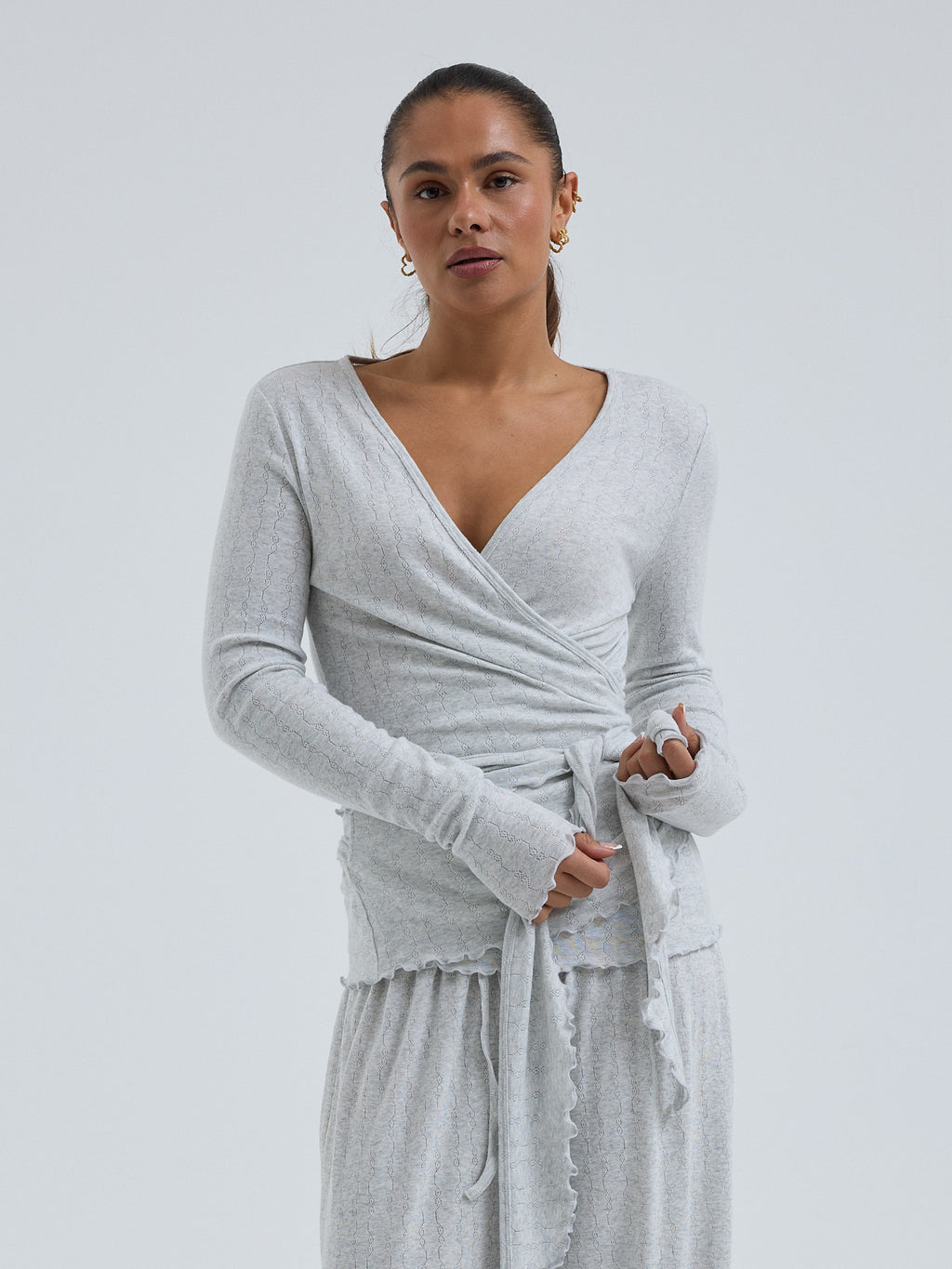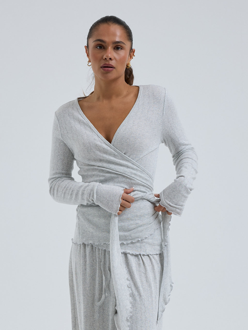 Pointelle Wickelbluse mit V-Ausschnitt und langer ärmeln.