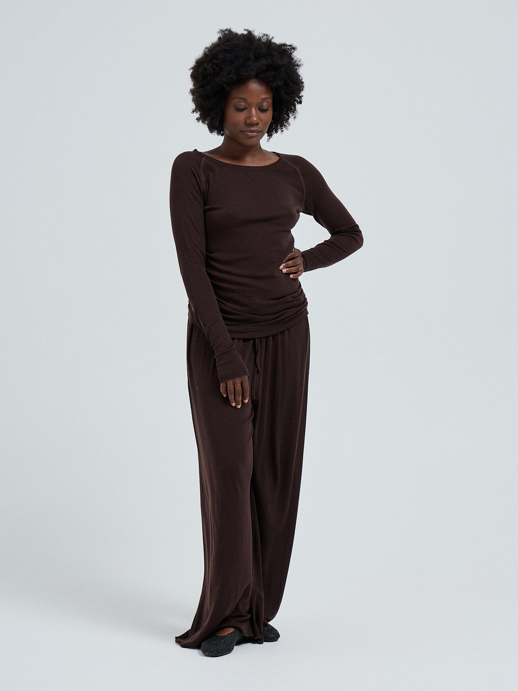 Locker geschnittene Hose mit elastischem Bund und Bindeband.